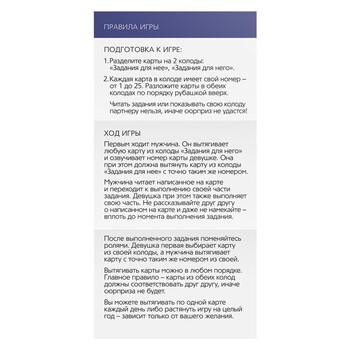Хотите сделать каждый день с любимым человеком незабываемым? Тогда пришло время перейти к романтическим действиям, которые разнообразят отношения и разделят их на: до и после. Секрет, как этого добиться, прост: вытягивайте карточки, готовьте для второй половинки приятные сюрпризы и наслаждайтесь совместным временем!